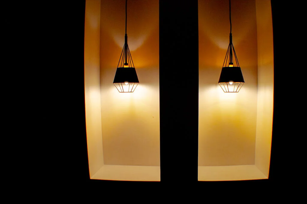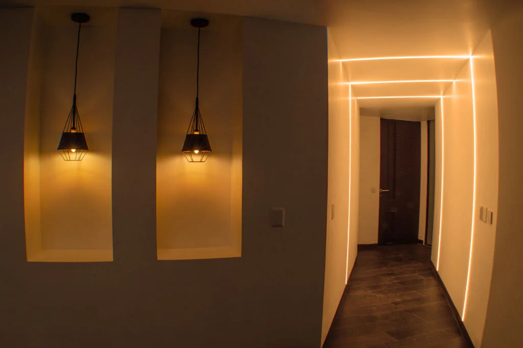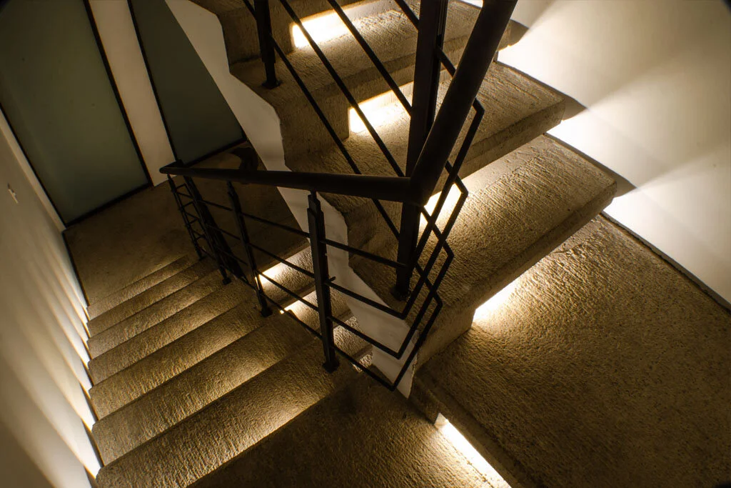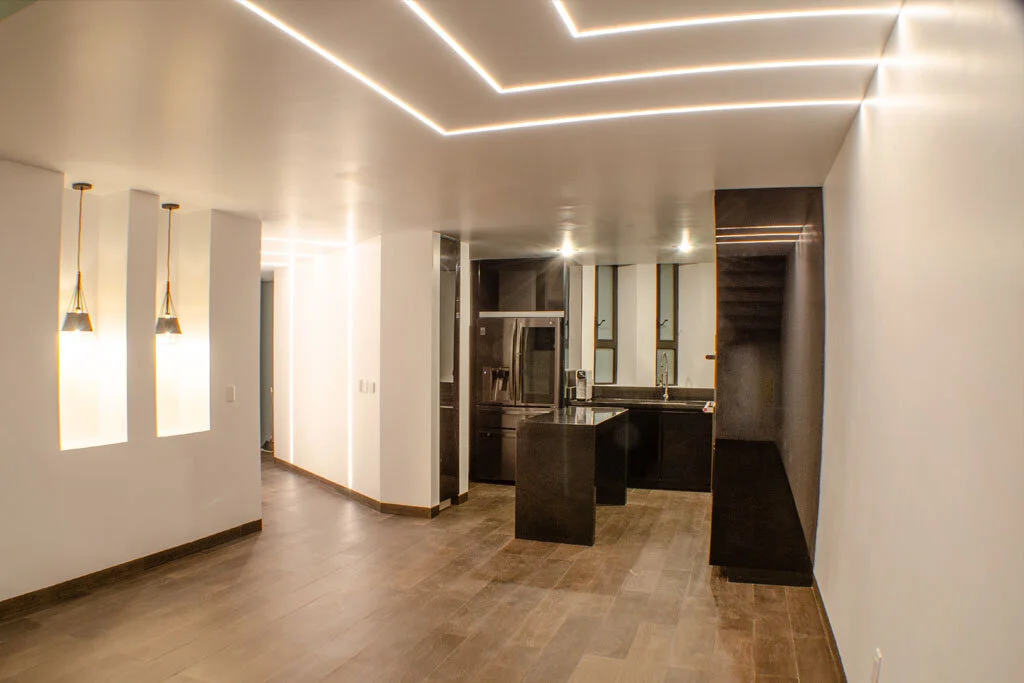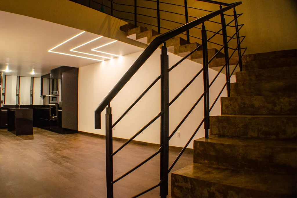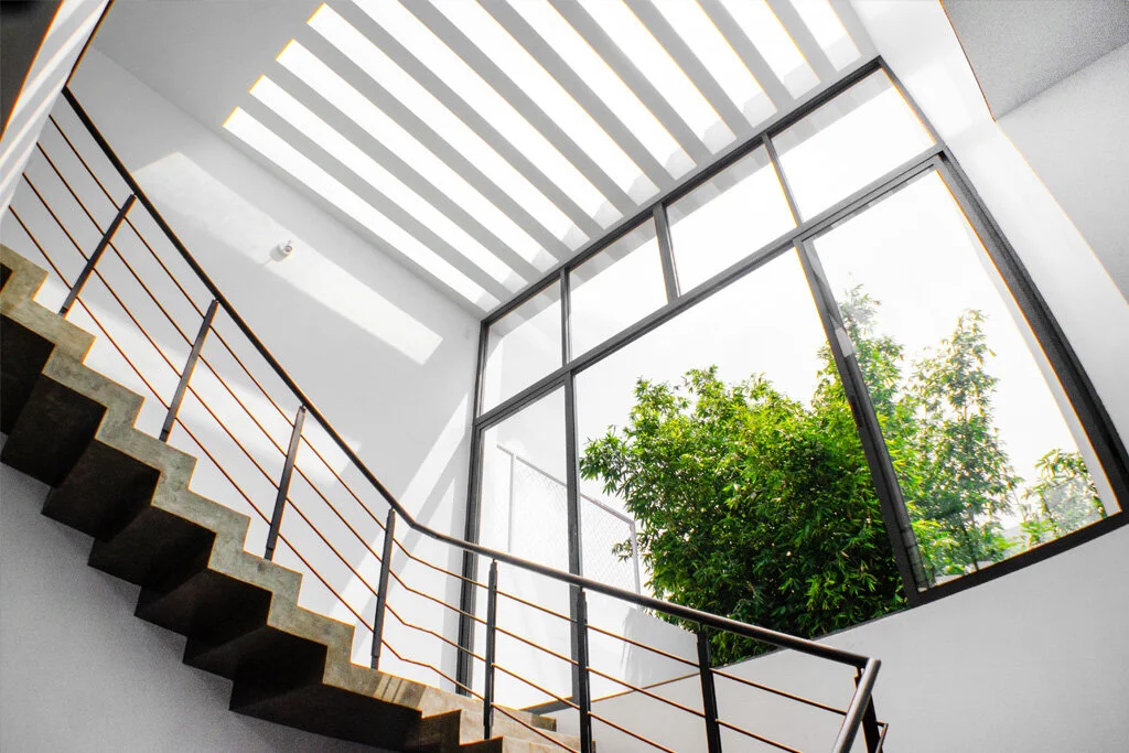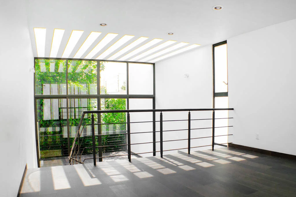 El departamento en planta baja cuenta con un patio trasero y otro patio interior, ambos proveen de iluminación y ventilación natural a esta vivienda. En el caso del departamento en planta alta, este cuenta con dos niveles conectados por una escalera de concreto pulido, dos terrazas, una a la que se accede por el descanso de la escalera y otra al lado de una sala de TV, esta última está pensada para albergar un jacuzzi.